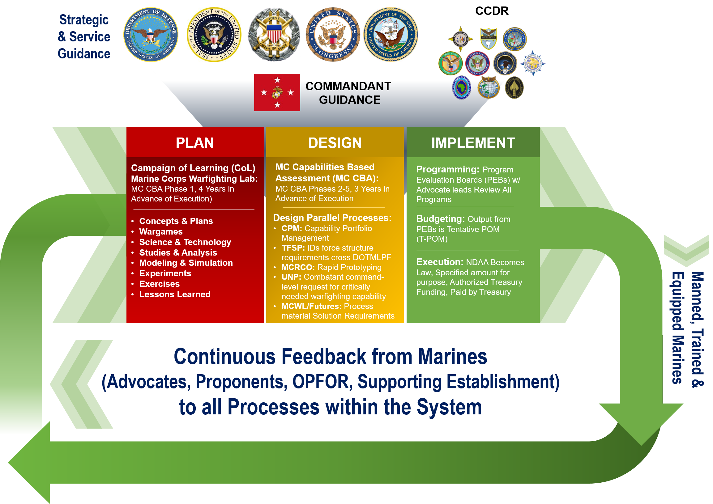 CD&I Force development activities Plan, Design, and Implement the translation of Strategic and Service Guidance into organized, trained, educated, and equipped Marine Corps. (click each stage to enlarge/click again to reduce)